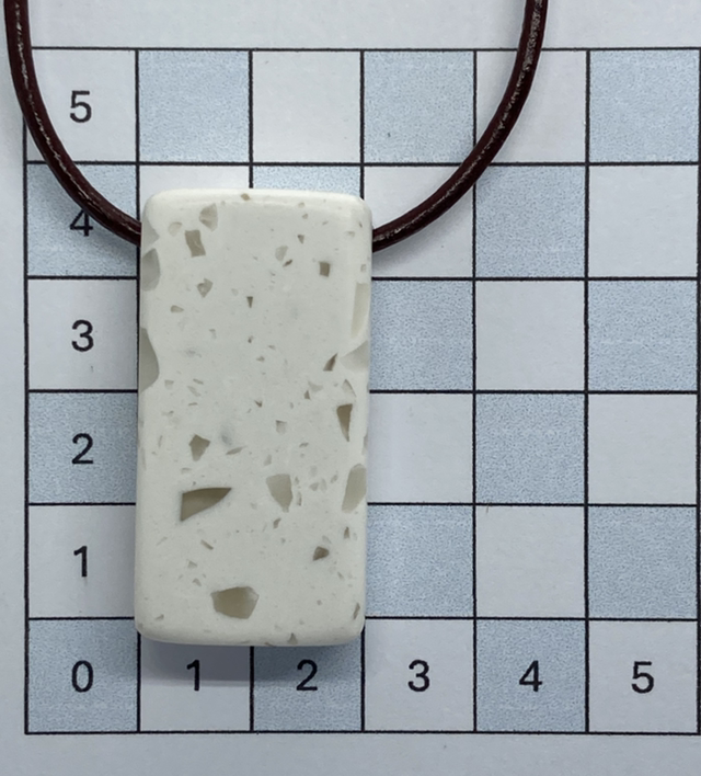 The creamy white acrylic features subtle flecks of beige and stone tones, giving it a soft terrazzo look. Each pendant is individually cut, shaped, and polished by hand, then paired with a simple brown leather cord for a clean, modern style that complements any outfit.