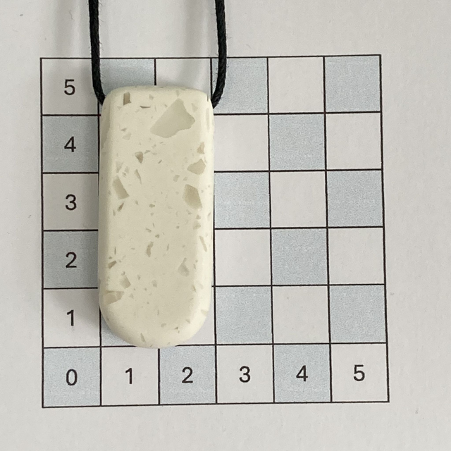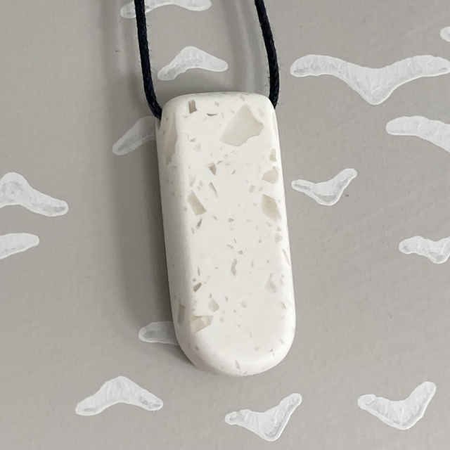 This handmade rectangular pendant features a rounded base and is crafted from terrazzo-style acrylic, reclaimed from leftover worktop during our kitchen renovation. Its smooth surface and embedded fragments give it a modern, speckled finish. Hand-polished to a satin shine, this pendant is a minimalist statement with a sustainable soul.