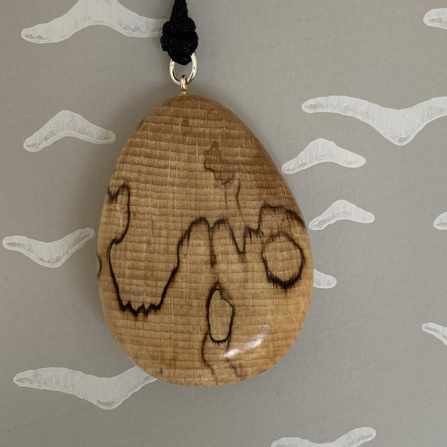 A chunky pebble shaped pendant made from spalted beech which has a beautiful pattern against the tight grain of the wood and finished in glossy hard wax. The pendant is black waxed cotton, adjustable from roughly 40-70cm/16-27", with sterling silver crimp ends which act like sliding knots (but nicer).