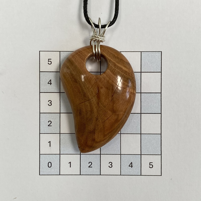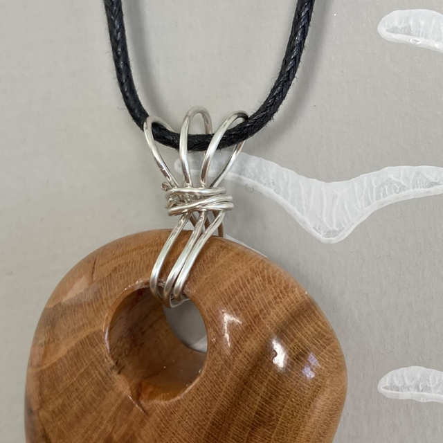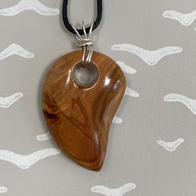 A glossy shark tooth shaped pendant made from cherry giving the lovely orangey colour. It's from the join of a branch to the trunk which creates some beautiful grain patterns. The bail is sterling silver wire twisted to create a unique shape. The necklace is black waxed cotton, approximately 46cm/18" long fastening with a sterling silver bolt ring clasp.