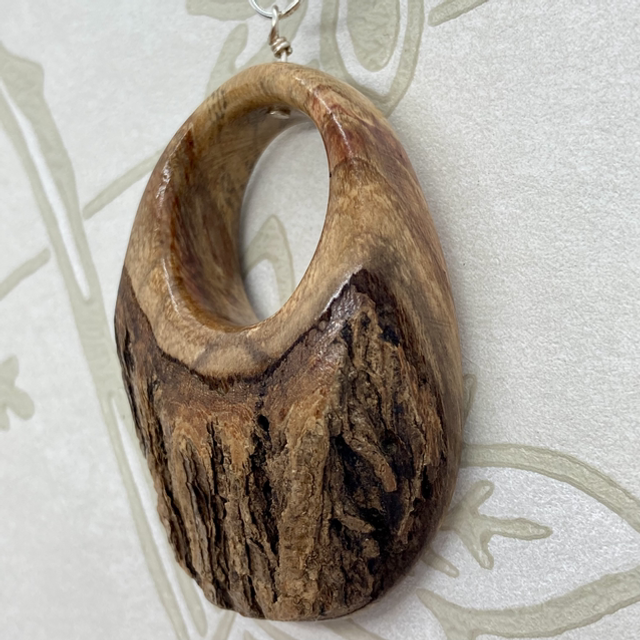 A beautiful and unique pendant made from spalted gorse showing a red colour in the grain. It has bark on the back adding texture and with the hole it makes it a very tactile piece of jewellery. You’ll be fiddling with it all day long.