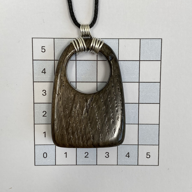 A dark oak, square bottomed pendant with a spring shaped sterling silver bail finished in a high gloss hard wax. The dark oak and silver contract nicely.