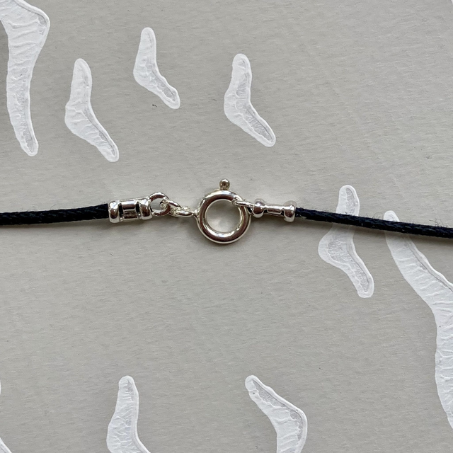 The pendant is black waxed cotton, approximately 46cm/18" long, finished with sterling silver ends and bolt ring clasp.