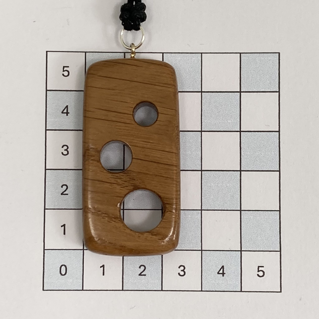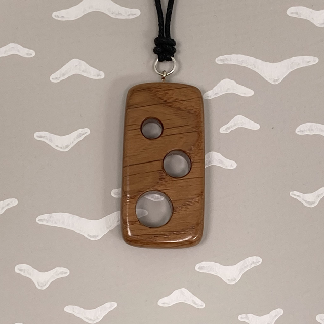 A simple oak pendant which shows off the rays in the wood more than the grain itself (which is more visible on the side). There are 3 offset holes making it quote tactile. The wood is from an old church pew which was being turned into a cupboard. It's finished with glossy hard wax and an adjustable black waxed cotton necklace. The necklace adjusts from roughy 40-80cm/16-30" using sterling silver crimp ends in place of sliding knots.