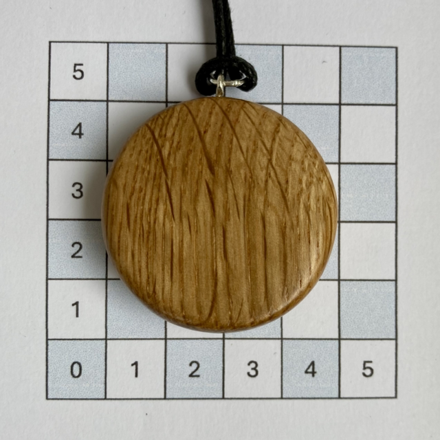 A handmade wooden pendant necklace using a beautifully grained oak and finished with a hard wax satin polish. The pendant is round and tapers in thickness towards the top. It’s small but chunky with a nice weight to it. The outer edges are rounded giving it a smooth feel. This piece really showcases the grain, maybe because it is a light colour, and there are some rays adding contrasting lines.