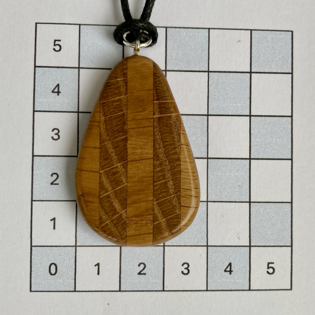 A handmade teardrop shaped wooden pendant using oak strips and finished with a satin hard wax polish. The oak is all from the same piece of wood but strips are showing alternate grain patterns which gives it the different shades. It has a black waxed cotton necklace.
