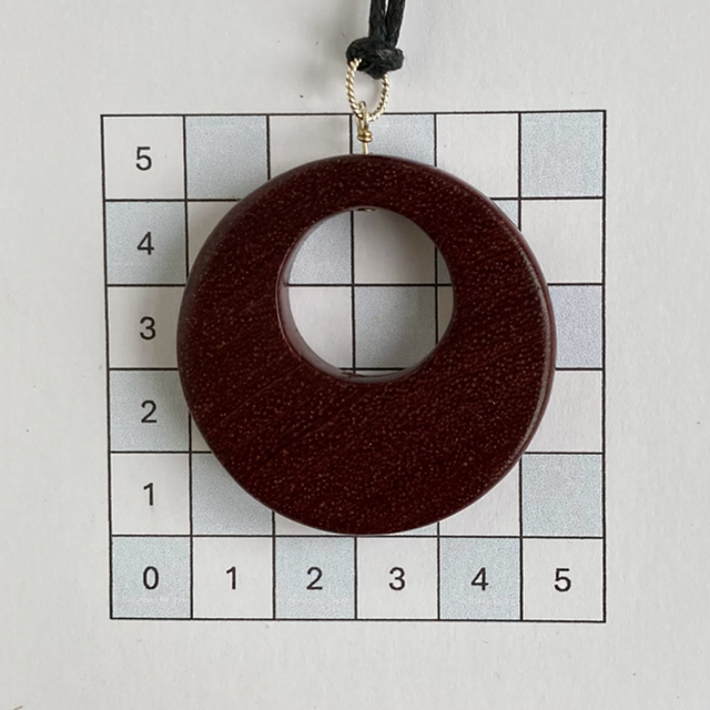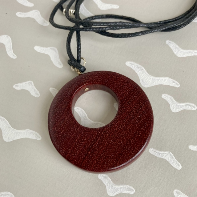 A handmade wooden pendant necklace using a dark, purple heart wood finished with a hard wax satin polish. It is a circle with an offset hole. The main faces of the pendant are the end grain which is why it is such a deep purple. The side is lighter.