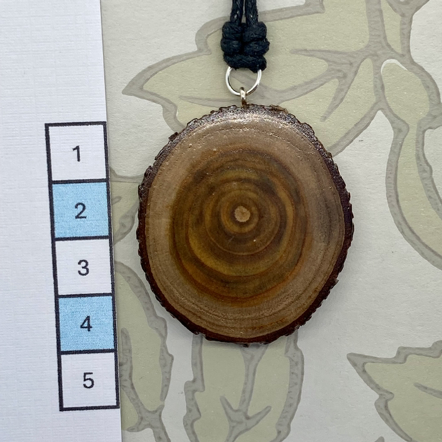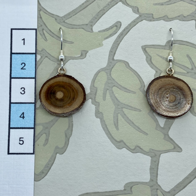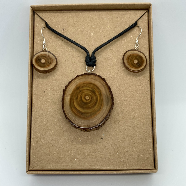 A handmade circle wooden pendant necklace made from smoke bush (Cotinus) with matching earrings and finished with a glossy hard wax polish. The smokebush is a beautiful wood with a golden yellow heartwood and a white outer. These are simple slices through the branch so you can see all the rings and it still has the bark which really adds texture. The earring hooks are sterling silver. It has a black waxed cotton necklace.